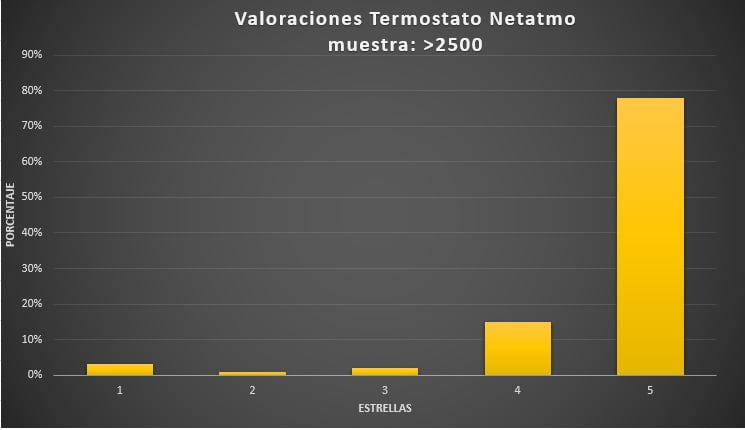 En resumen, del estudio de las valoraciones de los clientes podemos inferir que el termostato Netatmo es un producto de altas prestaciones, que al llevar tiempo en el mercado ha ido puliendo fallos de funcionamiento. Hay que destacar también el bajo número de valoraciones negativas, la mayoría debidas a fallos de compatibilidad o entregas defectuosas de pedidos.