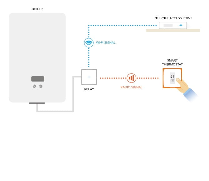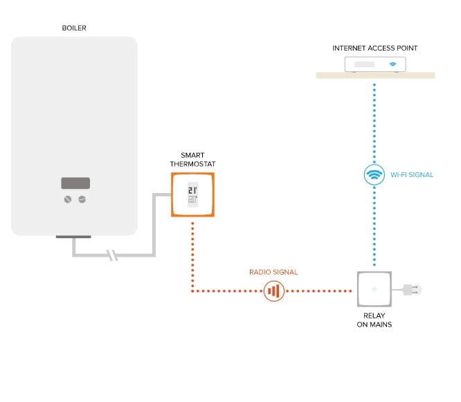 De esta manera, la conexión es cableada del relé a la caldera (este es el paso más complicado de la configuración) y el funcionamiento del termostato wifi es mediante pilas. Con ello tenemos la opción de mover el termostato a nuestro antojo en cualquier momento sin más limitaciones que la distancia del relé al termostato. El relé Netatmo enlaza al router wifi, mediante señal radio se comunica con el termostato, y envía la orden de On/Off a la caldera.