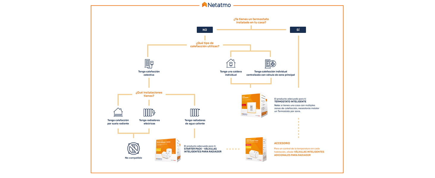 Las válvulas Netatmo NO FUNCIONAN PARA RADIADORES ELÉCTRICOS NI SUELO RADIANTE, además de lo anterior, si tu calefacción es individual y no tienes el termostato Netatmo, las válvulas sólo funcionarán cuando tu caldera esté encendida en función de la temperatura del termostato que tengas instalado, por lo que el funcionamiento no sería óptimo. Por lo tanto, lo ideal es adquirirlas si tu sistema de calefacción es central (de tu comunidad de vecinos, donde dispones de agua caliente sin limitaciones), o si dispones del termostato Netatmo en tu caldera individual.